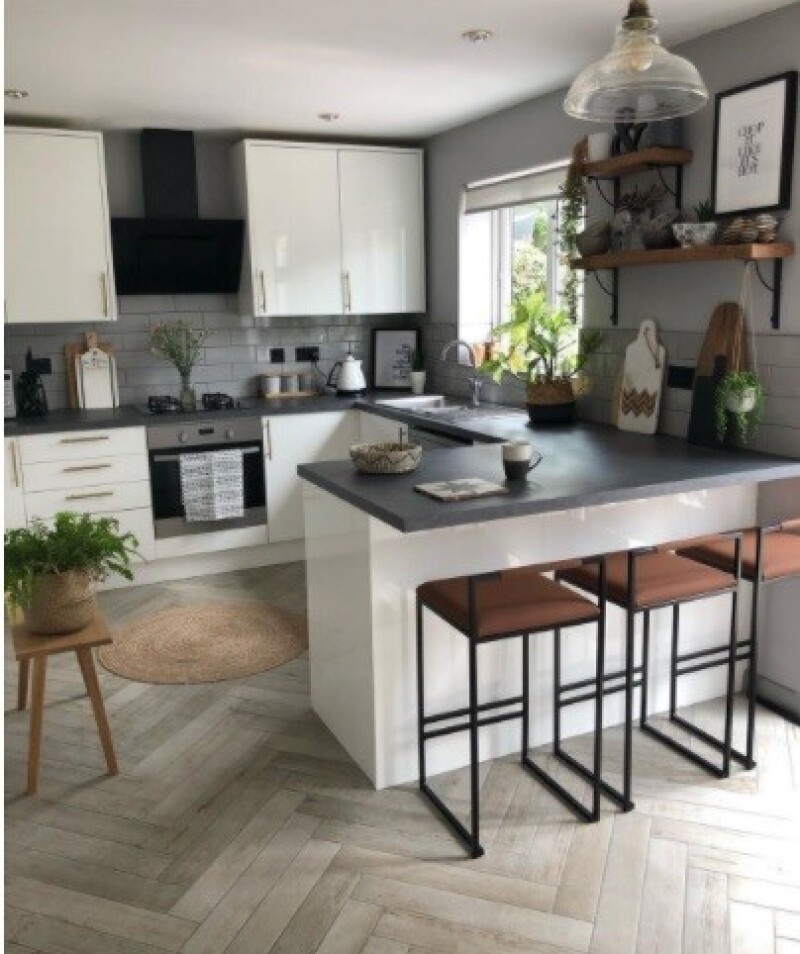Кольорова палітра та дизайн матеріалу плитки стін та підлоги повинні поєднуватись з кухонним гарнітуром, шторами та іншими меблями.