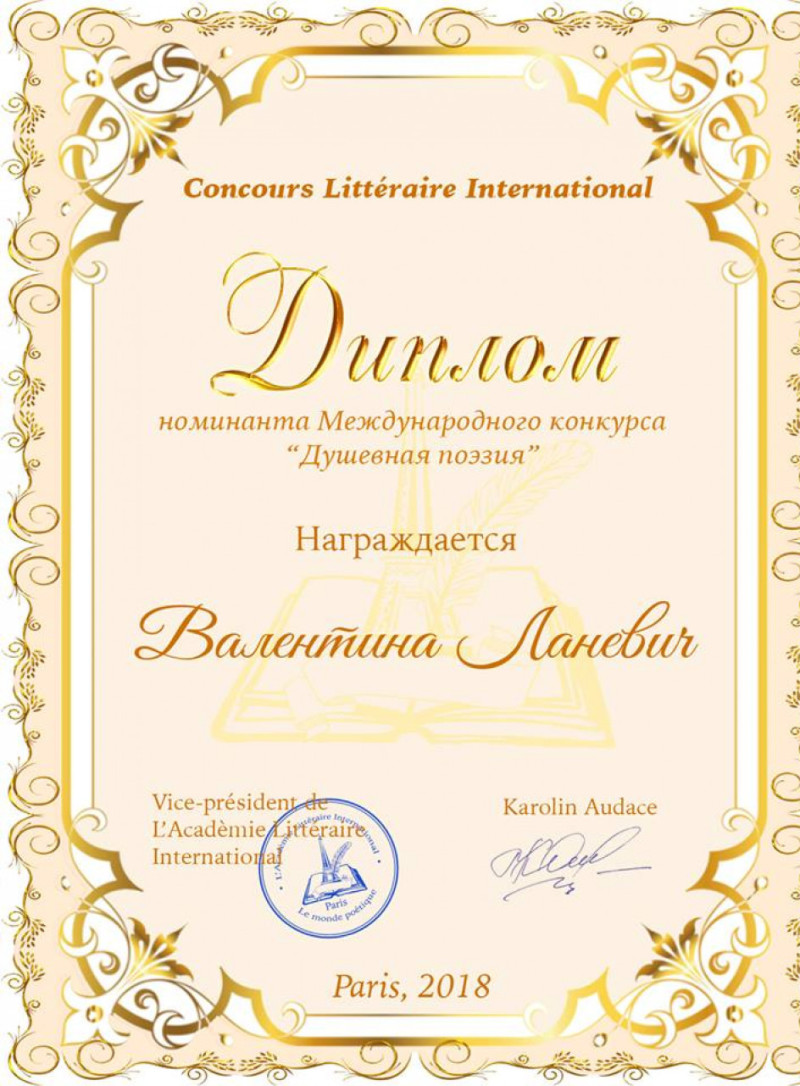 Любешівську поетесу Валентину Ланевич відзначили дипломом міжнародного літературного конкурсу в Парижі.