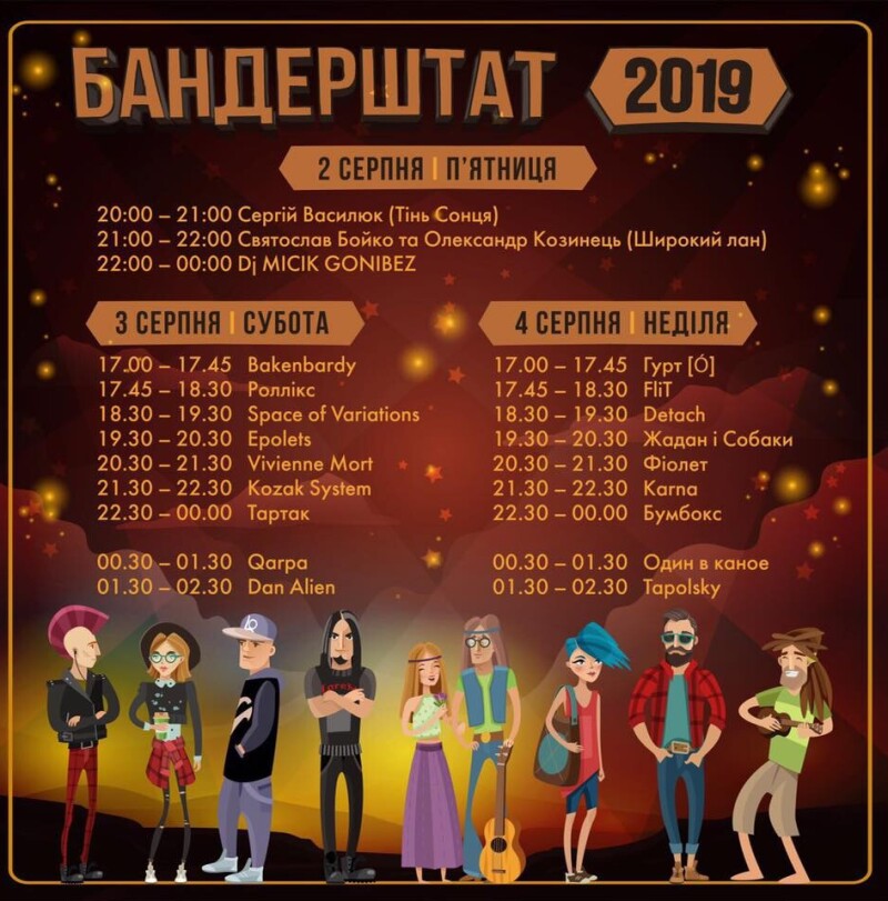З'явилась погодинна програма музичних виступів на фестивалі українського духу «Бандерштат», який відбудеться 2-4 серпня у селі Рованці під Луцьком.