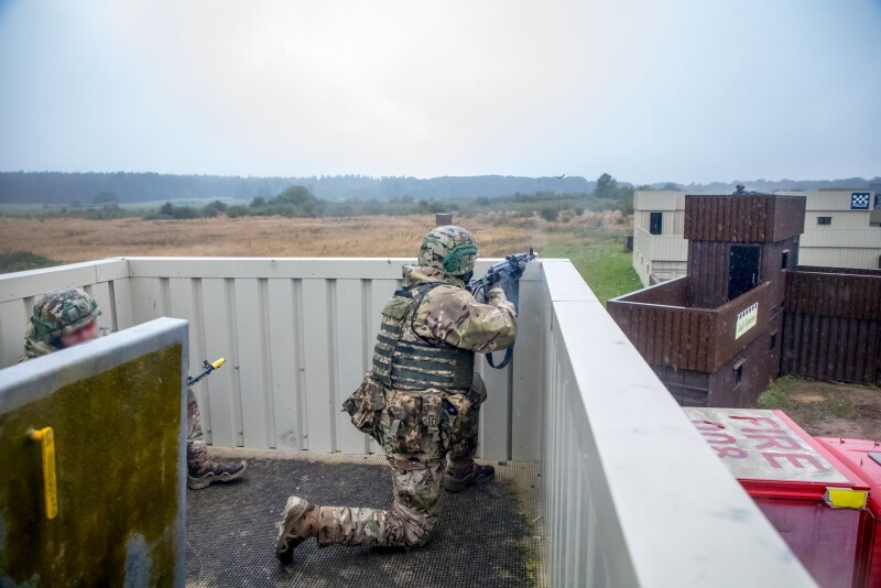Українські військовослужбовці, які проходять навчання у Великій Британії в межах багатонаціональної операції Інтерфлекс, беруть участь у заняттях з відпрацювання штурму і оборони міської забудови.
