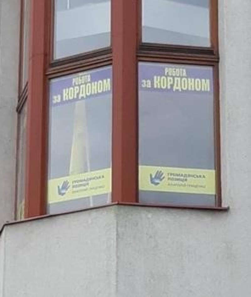 На вікнах партійного офісу за адресою вул. Драгоманова 1а, розклеїли банери в партійних кольорах, які закликають українців виїжджати закордон.