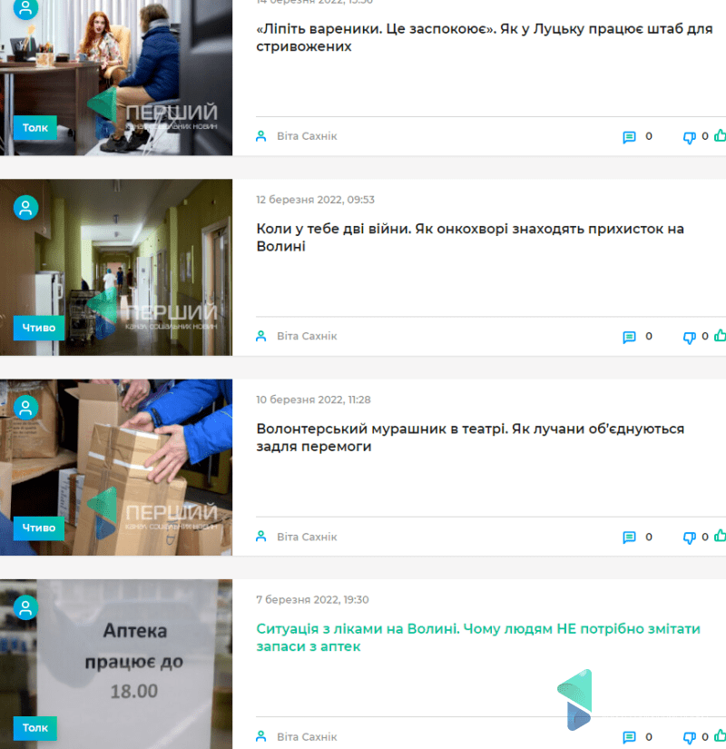 Це, звичайно, далеко не повний перелік авторських текстів року повномасштабного вторгнення росії в Україну. Ми також робили передруки важливих, на нашу думку, матеріалів колег, аби саме наші читачі могли бачити повнішу картину воєнного буття краю. Ці статті та місцеві й всеукраїнські новини з’являлися у нас на сайті завдяки праці редакторок стрічки, кожна з яких була потужним гвинтиком медіамеханізму «Першого».