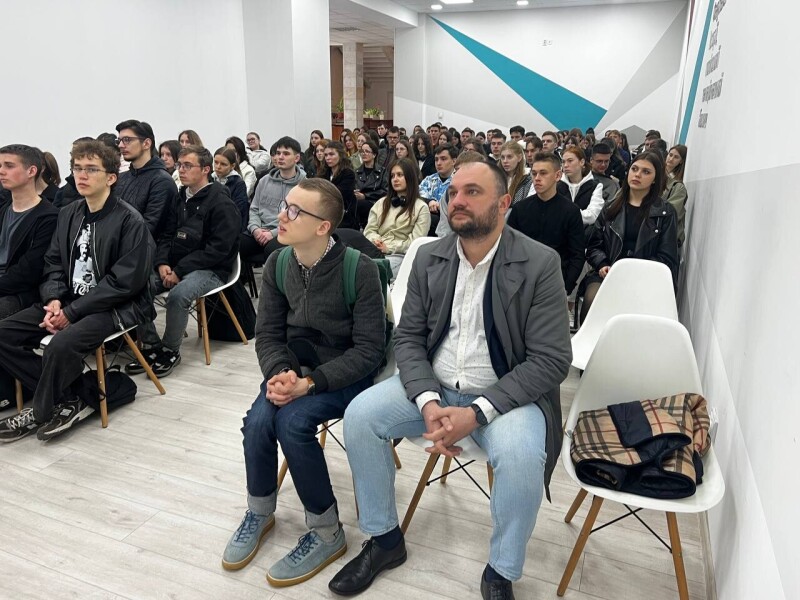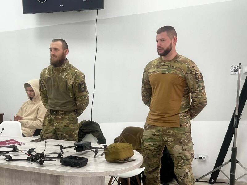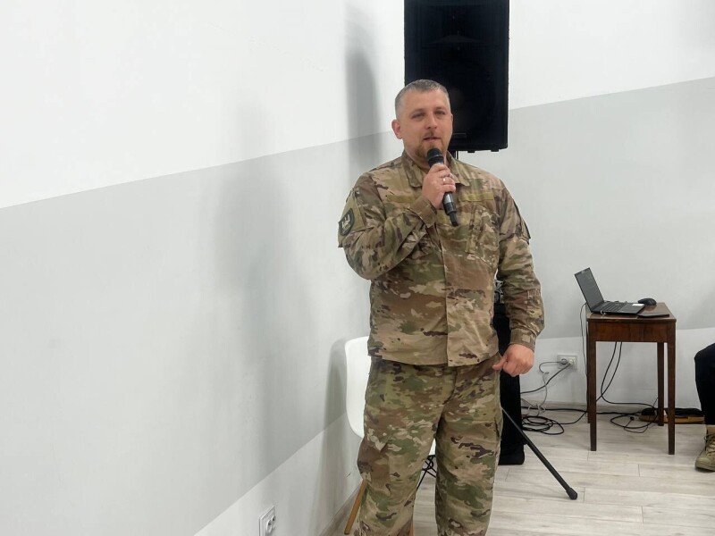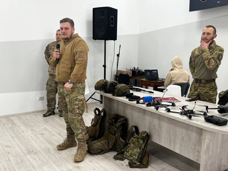 Військовий коротко розповів про тему зустрічі та представив своїх побратимів, які приїхали в Університет із Покровського напрямку: командира мінометної батареї полку «Сомалі», навідника танка Т80 «Рижого» та пілота безпілотно-наземного комплексу «Медоїда».
