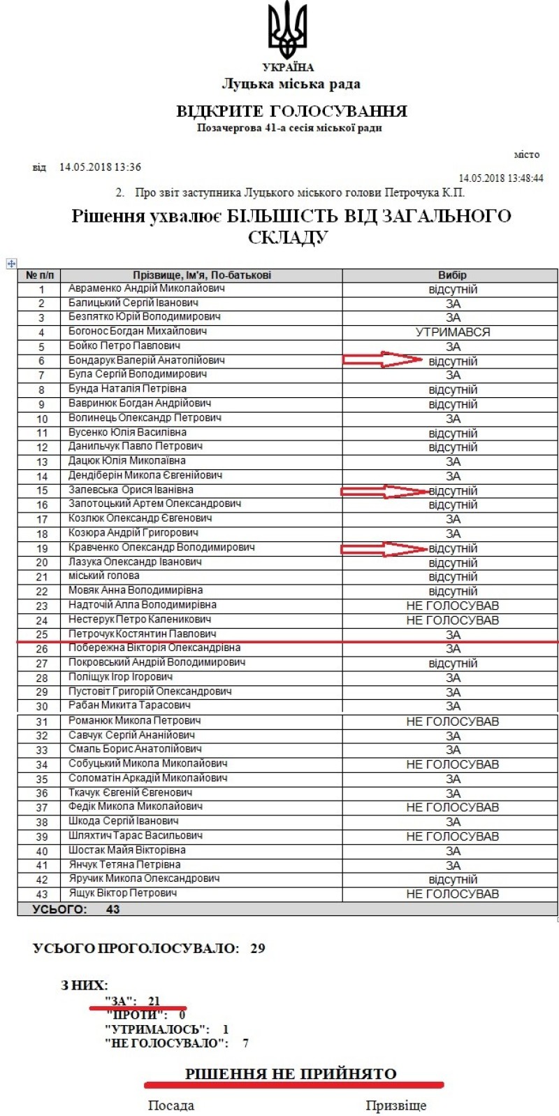 За це рішення обранці Луцької міської ради голосували тричі і щоразу – безуспішно. «За» звіт Костянтина Петрочука проголосував лише 21 депутат. І це при тому, що із 43 обранців – на сесії зареєструвалось 29.