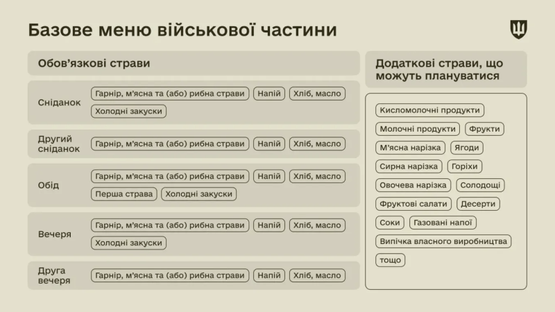 Триразове харчування передбачає сніданок, обід і вечерю. Також додатково готується друга вечеря для військовослужбовців, які несуть варту.
