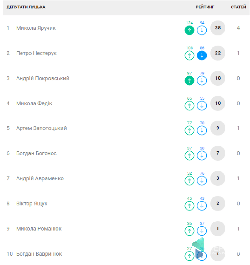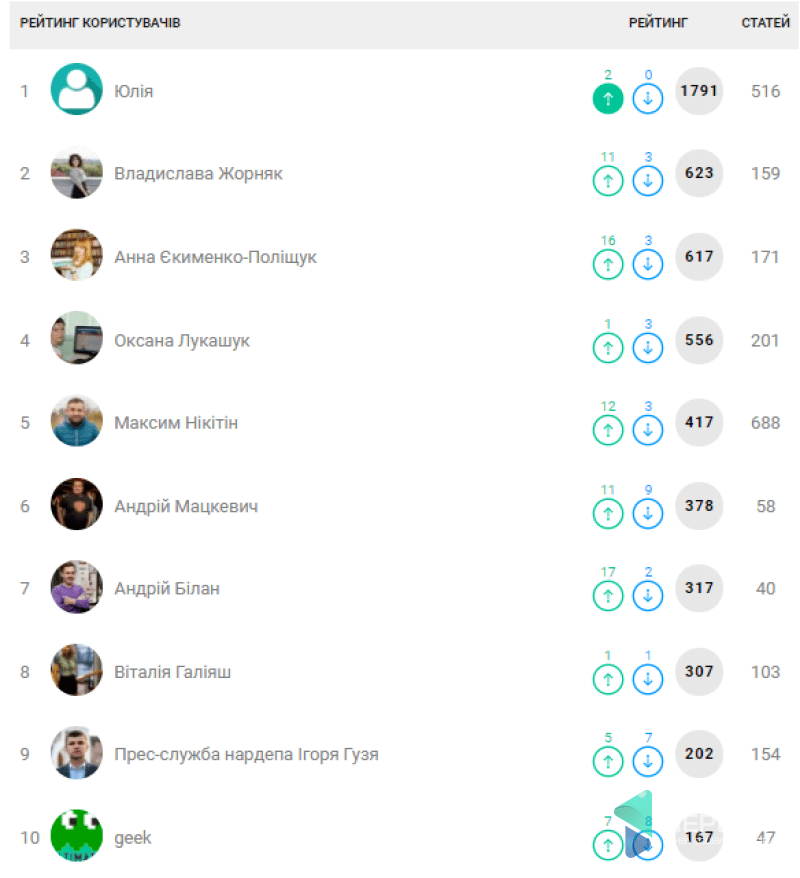 Нагадаємо, що на позицію у рейтингу формують оцінки користувачів сайту, які мають можливість як піднімати учасників, так і опускати їх та враховується кількість опублікованих статей.