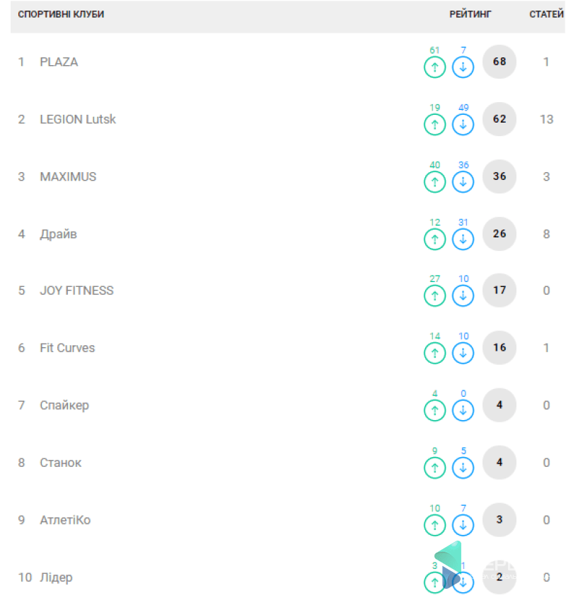 Майже однакову кількість голосів у рейтингу спортивних клубів набрали «PLAZA» та «Legion Lutsk»: