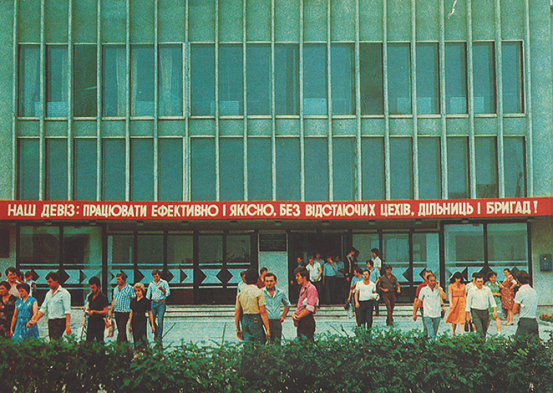 «Наш девіз: працювати ефективно і якісно, без відстаючих цехів, дільниць і бригад! Шовковий комбінат імені 60-річчя Радянської України. 1980-ті», – пидписали фото.
