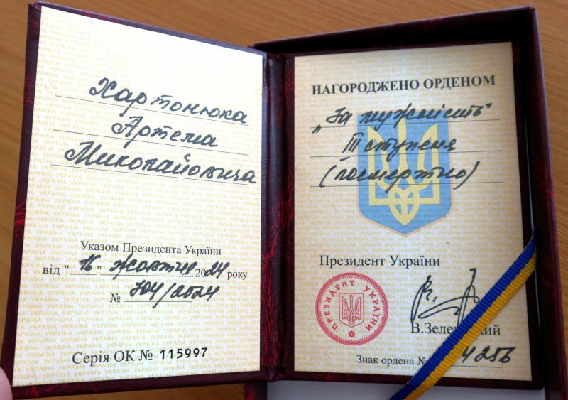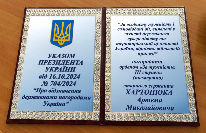 За особисту мужність і самовіддані дії, виявлені у захисті державного суверенітету та територіальної цілісності України, за вірність Військовій присязі орденом “За мужність” ІІІ ступеня (посмертно) (Указ Президента України від 16.10.2024 р. “Про відзначення державними нагородами України”) було удостоєно жителя селища Ратне — старшого сержанта ХАРТОНЮКА Артема Миколайовича, який загинув в січні 2024 року на території Пологівського району Запорізької області.