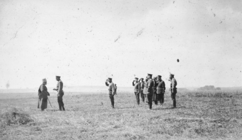 На фото – російські війська на чолі із Великим князем Георгієм Романовим, який був внуком російського імператора Миколи І. Під час Першої світової війни князь постійно перебував при ставці верховного головнокомандувача Миколи II. Був генерал-ад'ютантом. Його основним завданням були постійні поїздки по фронтах з подальшим складанням донесень про загальний стан.