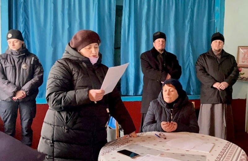 На зборах були присутні жителі села, священники ПЦУ, староста Оксана Морозюк та представники поліції. Місцевий піп не з’явився, його представляла попадя Людмила Тарасюк.
