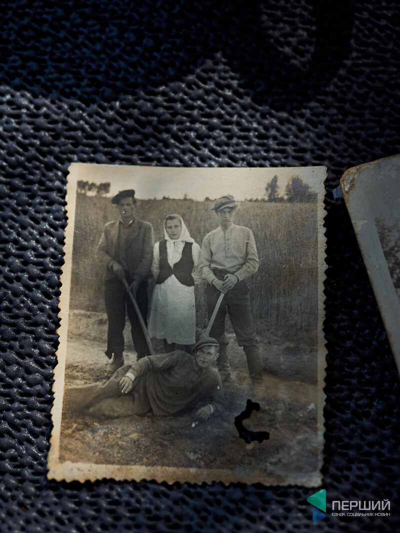 Ми сидимо за столом, гортаємо старі світлини, знаходимо саме ту, з якої видно, як будувалася хата Терентія. Десь назріває 1939-й. Терентій у білій сорочці, камезельці та штанях он - у центрі. Зовсім скоро хату і все, що нажив, йому доведеться віддати. Помер у 73 роки.