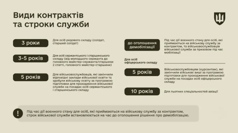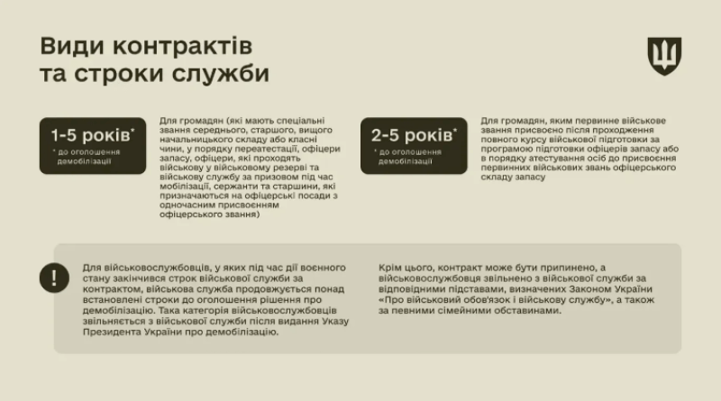 Під час дії воєнного стану для осіб, які приймаються на військову службу за контрактом, строк військової служби встановлюється на час до оголошення рішення про демобілізацію. Крім цього, відповідно до законодавства, контракт може укладатися на такі строки:
