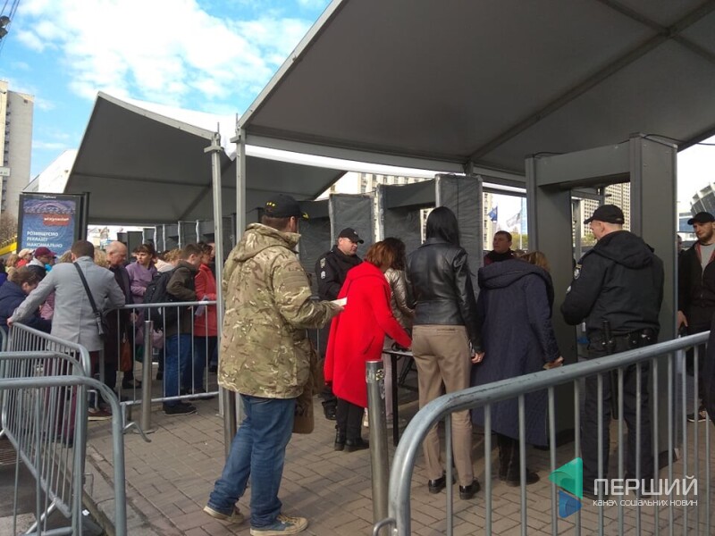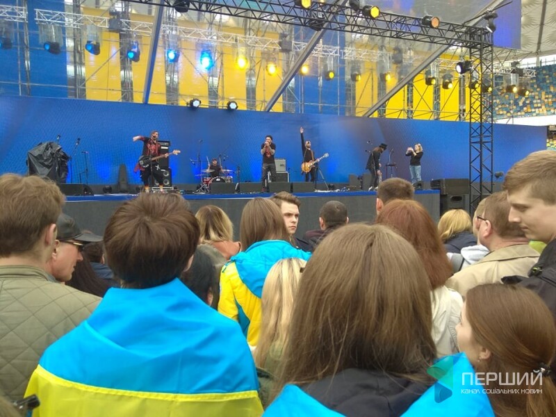 Частина людей уже змогла пройти на стадіон. Як повідомляє журналіст Першого, всередині поки не багато глядачів, стоїть дві сцени по різні боки арени. На одній сцені відбувається концерт. Фан-зони розмежовані кордоном поліції.