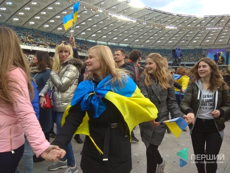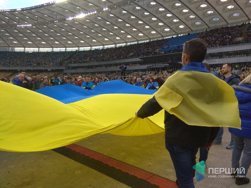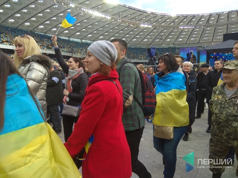 Станом на 17. 30 на НСК «Олімпійський» розгорнули кількаметровий прапор. Виступає гурт «Козак систем». Сцени працюють по черзі. Більшість людей – з прапорами і жовто-блакитними стрічками