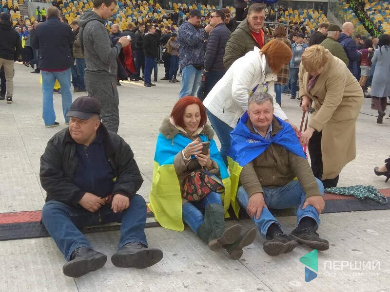 Поблизу стадіону, де мають відбуватися дебати кандидатів, багато людей з нацпрапорами. Портійної символіки – не видно.