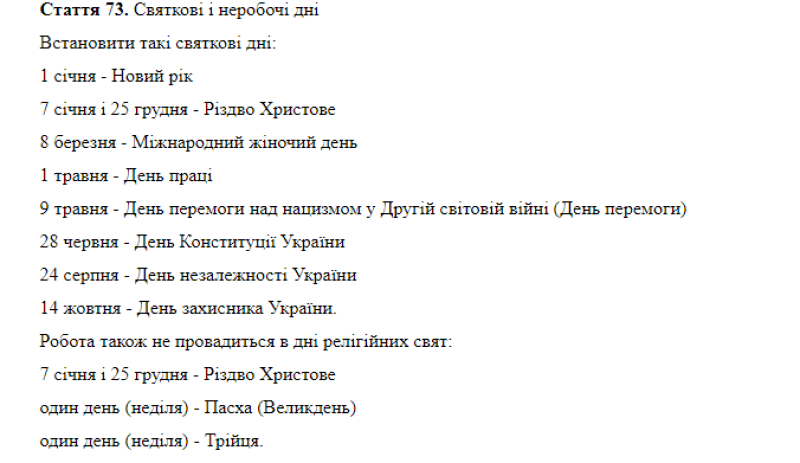 Згідно зі статтею Кодексу законів про працю, встановлено такі дати:
