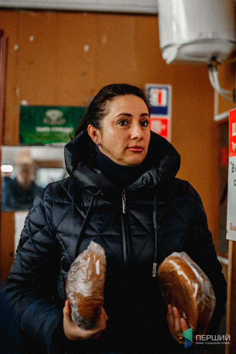 Вона знає тут кожного. «Чого без палички?», «Що ж ви в куточку стоїте, ходіть сюди, не соромтеся», «Все буде добре, беріть»… А руки тим часом хутенько розкладають хлібини в порепані долоні (більшість у натовпі – старі люди). Хліб Шафети купують за свої гроші. Раніше брали теремнівський, тепер замовляють аж у тернополян, бо трохи дешевше.