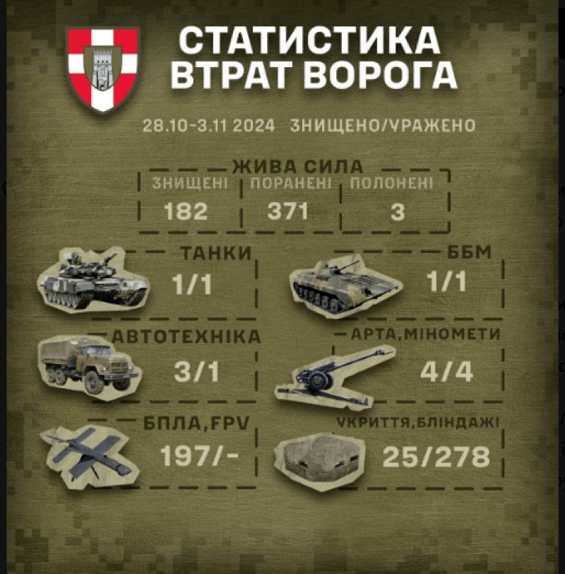 Підрозділи «Сталевої Сотки» продовжують завдавати відчутних ударів по противнику. За період з 28 жовтня по 3 листопада 2024 року військовослужбовці продемонстрували високу ефективність на полі бою, завдавши значних втрат живій силі та техніці окупантів.