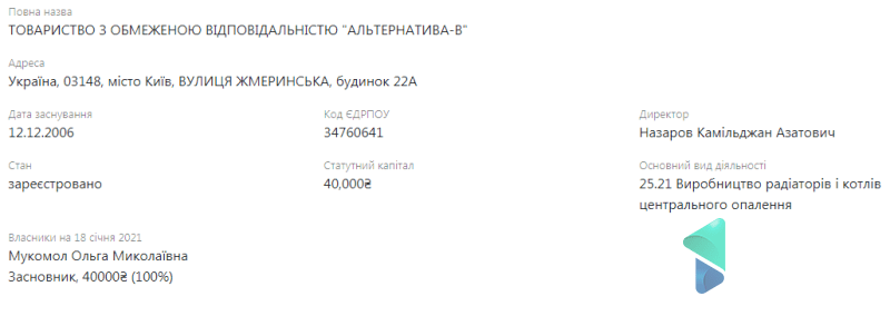 ТОВ «Альтернатива В» теж має київську «прописку». Власником є підприємець Камільджан Назаров. Цікаво, що основний вид діяльності цієї структури – виробництво радіаторів і котлів.