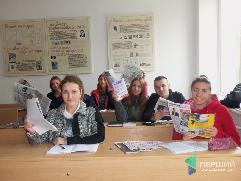На фото – Олена Лівіцька, Світлана Головачук, Юлія Мельничук, Андрій Лучик, Михайло Наход та ін.Ми тоді були переможцями студента року в різних номінаціях.