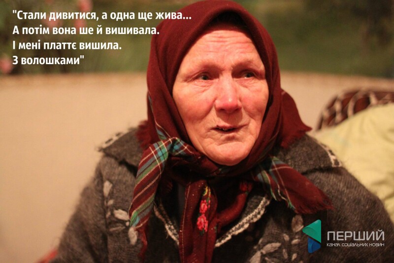 «Чекайте… - перебиває нечутні роздуми заплакана Марія. Хустку поправляє. - А посля, як німци побили, стали дивитися тих людей, а одна там жива. Її ранили в руку, але вона потім ше й вишивала. Ше й мені плаття вишила. Волошками. Біле, штафельне».