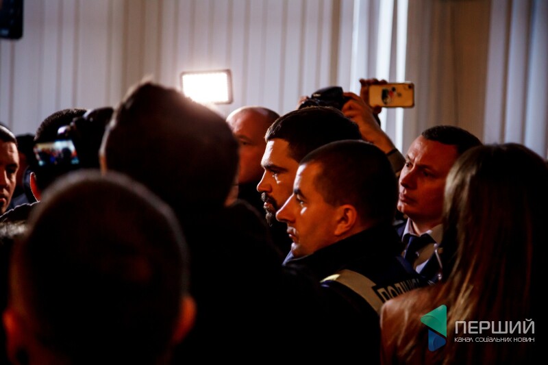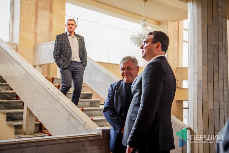 Гості стрімко піднімаються до приймальні голови ОДА. За 3 хв впевненим кроком виходять звідти і прямують в овальну залу. В руках у Сергія Трофімова біла папка з указом Зеленського.