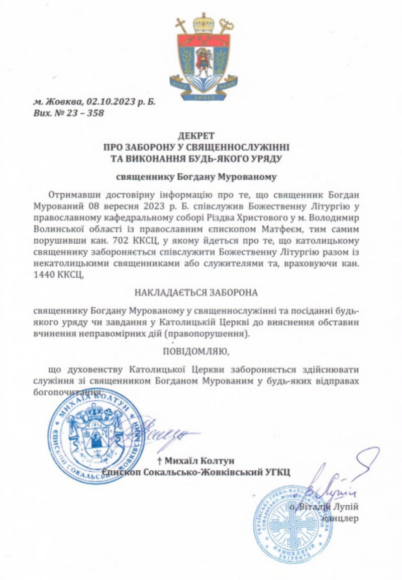 Священику Богдану Мурованому Сокальсько-Жовківська Єпархія Української Греко-Католицької церкви видала «Декрет про заборону у священнослужінні».