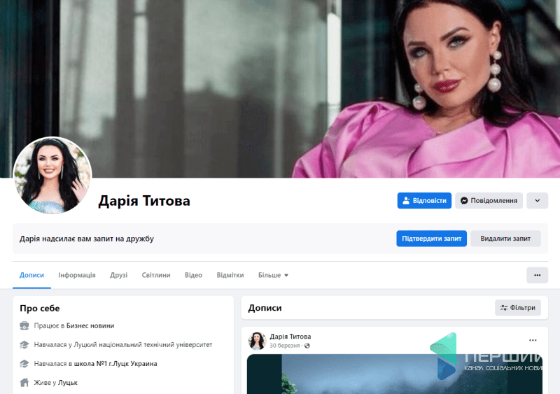 - з «Дарією Титовою», яка живе у «Луцьк», навчалася у «школа №1 г.Луцк Украина» та «Луцкий національний технічний університет» і була активна у себе на сторінці лише пів місяця у березні 2023, проте встигла там напостити фото та тонну російськомовних дописів із груп «Вдохновение», «Путешественник», «Интересная планета» і навіть вказує, що працює у «Бизнес новини», де обмаль інформації, але вона – з Болгарії, як і адміністратори групи, у мене – спільні друзі.