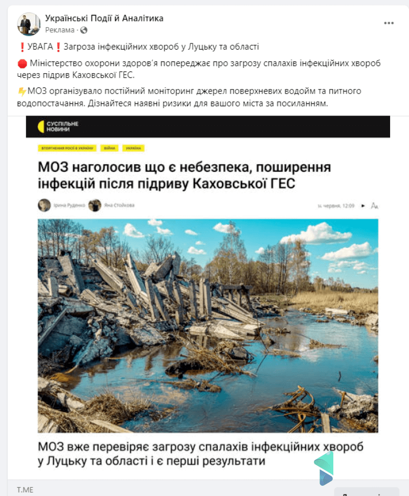 «МОЗ наголосив що є небезпека, поширення інфекцій після підриву Каховської ГЕС» (правопис оригіналу збережено). Це «залітає» у мою стрічку новин у «Фейсбуці» одного з червневих вечорів. Щоправда, як реклама. З правильно обраною цільовою аудиторією. І мені, волинянці, мешканці Луцька, втюхують картинку, під якою читаю «МОЗ вже перевіряє загрозу спалахів інфекційних хвороб у Луцьку та області і є вже перші результати».