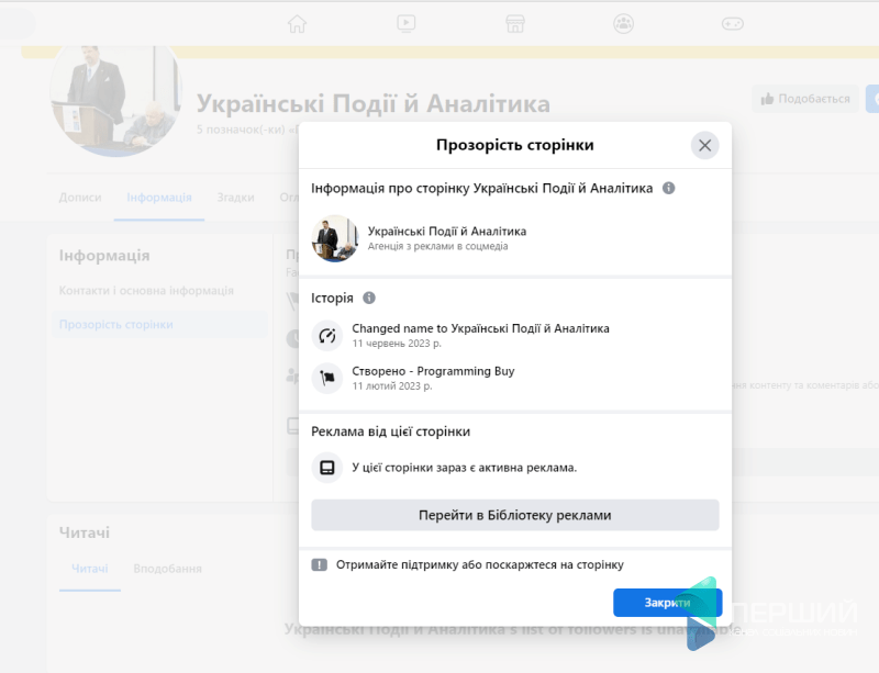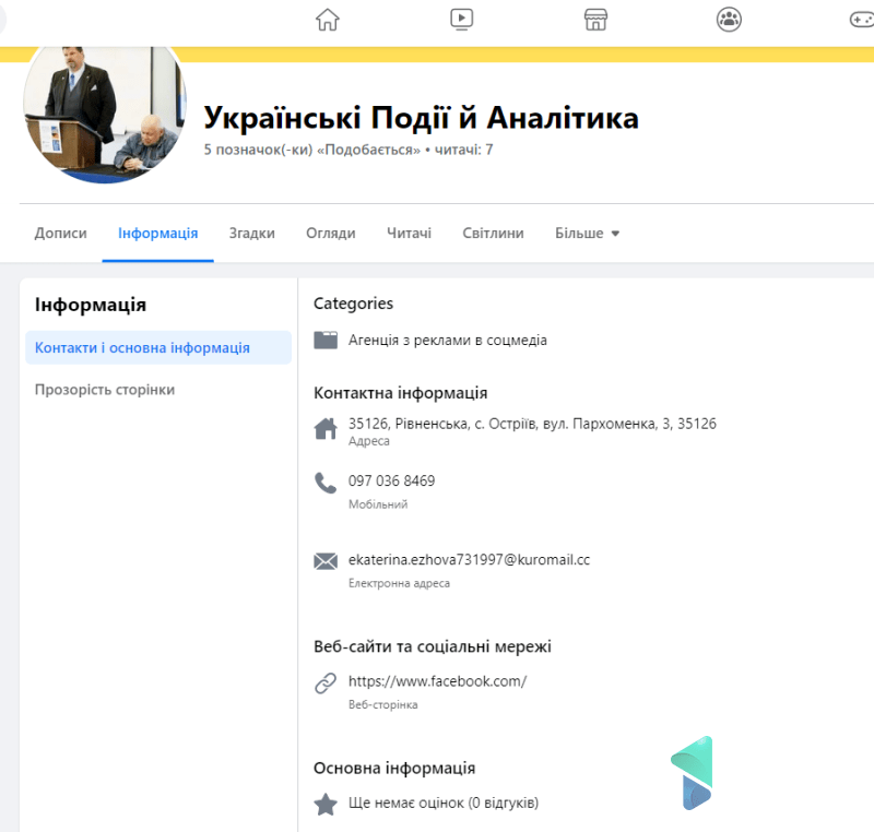 Отож, найперше – про сторінку, яка ї поширює. Вона має назву «Українські Події й Аналітика». Ніби – багатообіцяюче. Але – переходимо на неї й відчуваємо глибоке здивування. Там – ні подій, ні аналітики. Сторінка позиціонує вже себе як агенція з реклами в соцмедіа. Має 7 позначок «Подобається» і 10 читачів. За час існування лише оновила двічі основну світлину та фото обкладинки.