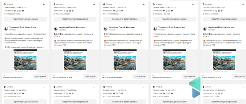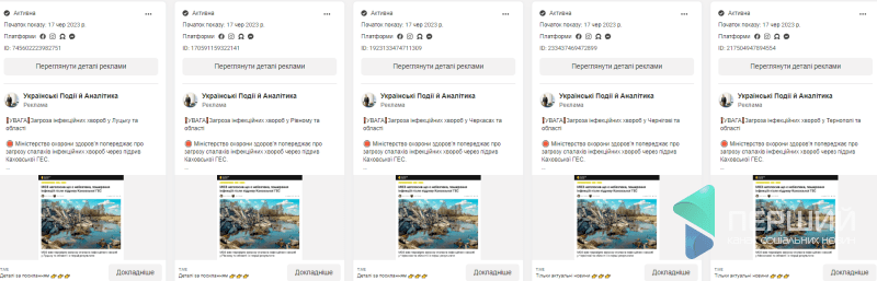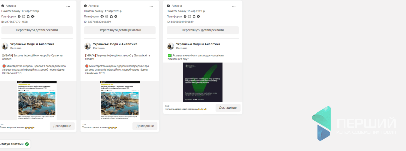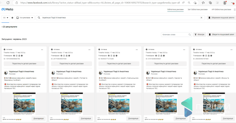 Але найцікавіше на цій сторінці «випливає», коли досліджуєш її прозорість. ФБ фіксує, що на ній є активна реклама. Натискаємо «Переглянути все», «Перейти в «Бібліотеку реклами». І бачимо, що з неї запущено аж 23 реклами в один день. Усі – однаковісінькі, однак все ж мають відмінність – націлені на мешканців певного українського регіону та його обласного центру. Ще одна «реклама» – теж на суспільно-дражливу тему мобілізації.
