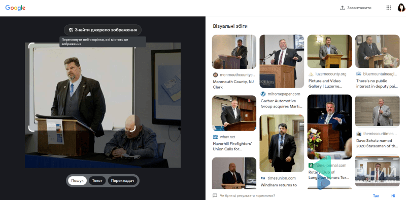 До слова, на згаданій вище сторінці «Українські Події й Аналітика» мене ще дуже зацікавила світлина із чоловіками. Один із них здався мені знайомим, однак я не могла взагалі пригадати, хто це. Тож аби знайти, де й коли це фото опублікували вперше, завантажила його для виявлення першоджерела через зворотній пошук на Зображення Google.