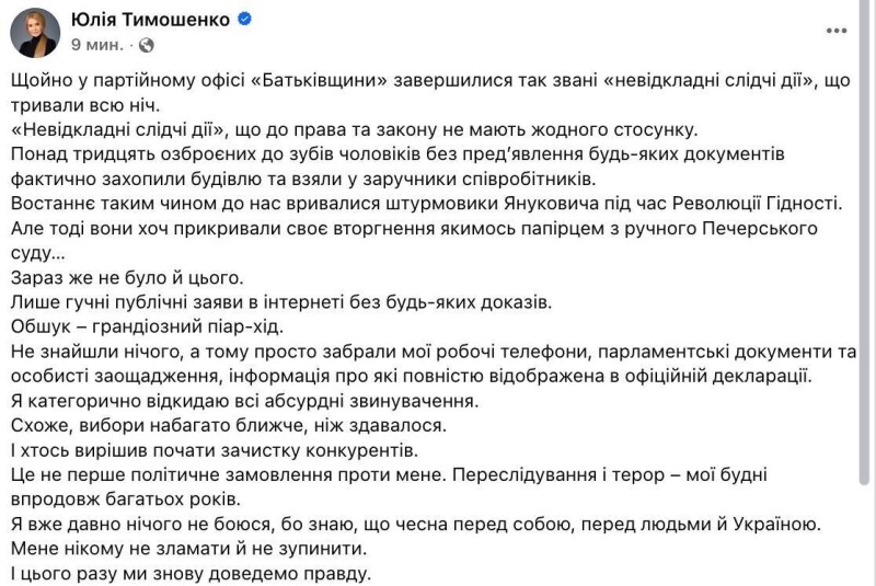 Народна депутатка України Юлія Тимошенко підтвердила обшуки у партійному офісі «Батьківщини», які тривали всю ніч, назвала їх «політичним замовленням» та відкинула звинувачення.