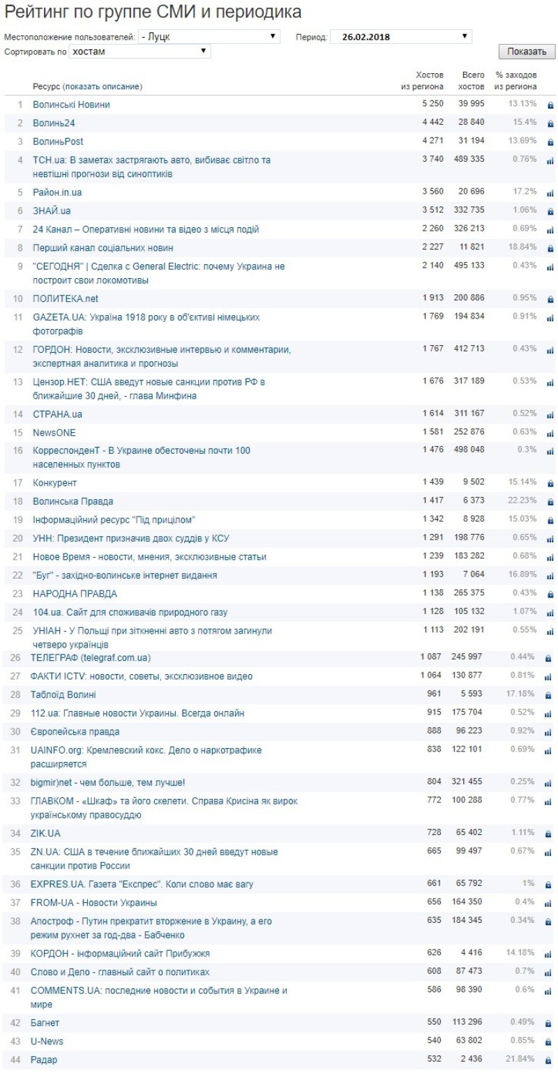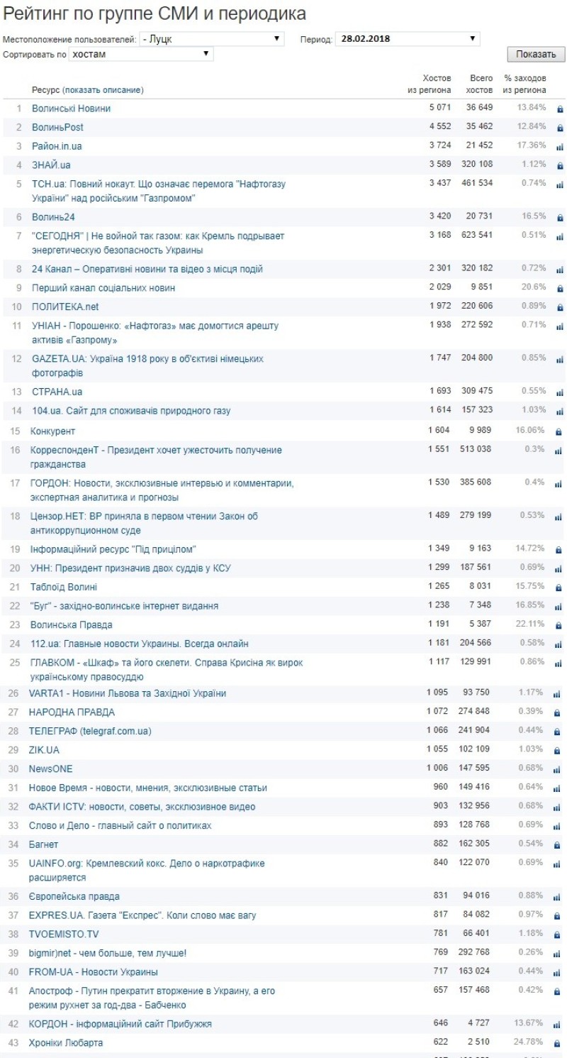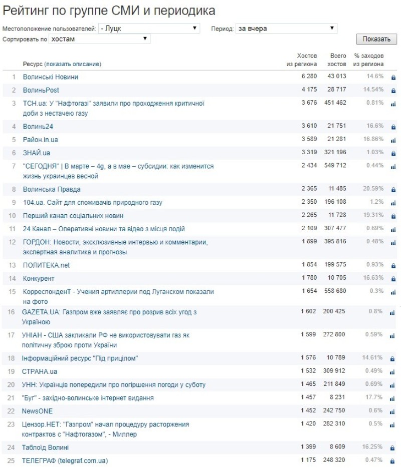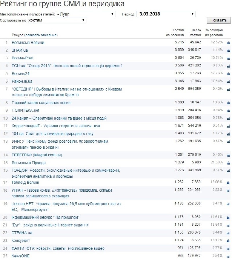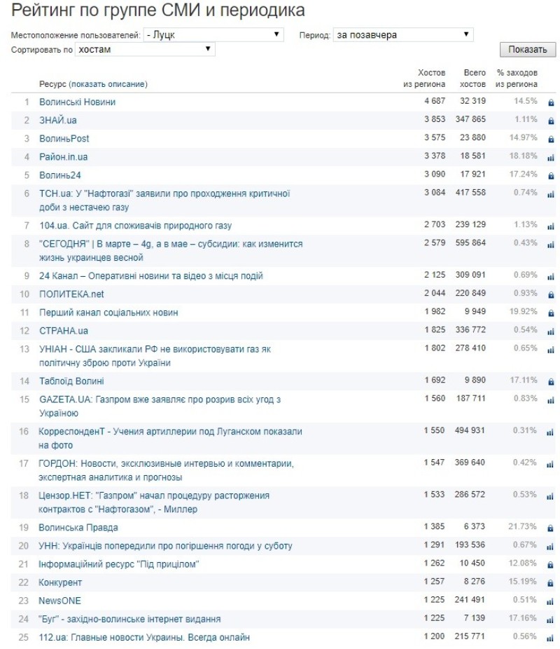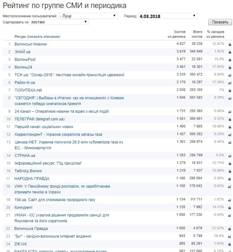 «Перший» продовжує аналізувати рейтинги сайтів з «волинською» пропискою на основі відкритих даних сайту «Bigmir)net». Зокрема, у розділі «Рейтинг по групі ЗМІ та періодика» за останній тиждень вдалось зібрати дані та визначити ТОП-10 найбільш читабельних сайтів Волині, виключивши з рейтингу решту популярних всеукраїнських видань (ТСН, Сегодня, 24 канал, Цензор.net, і т.д.).