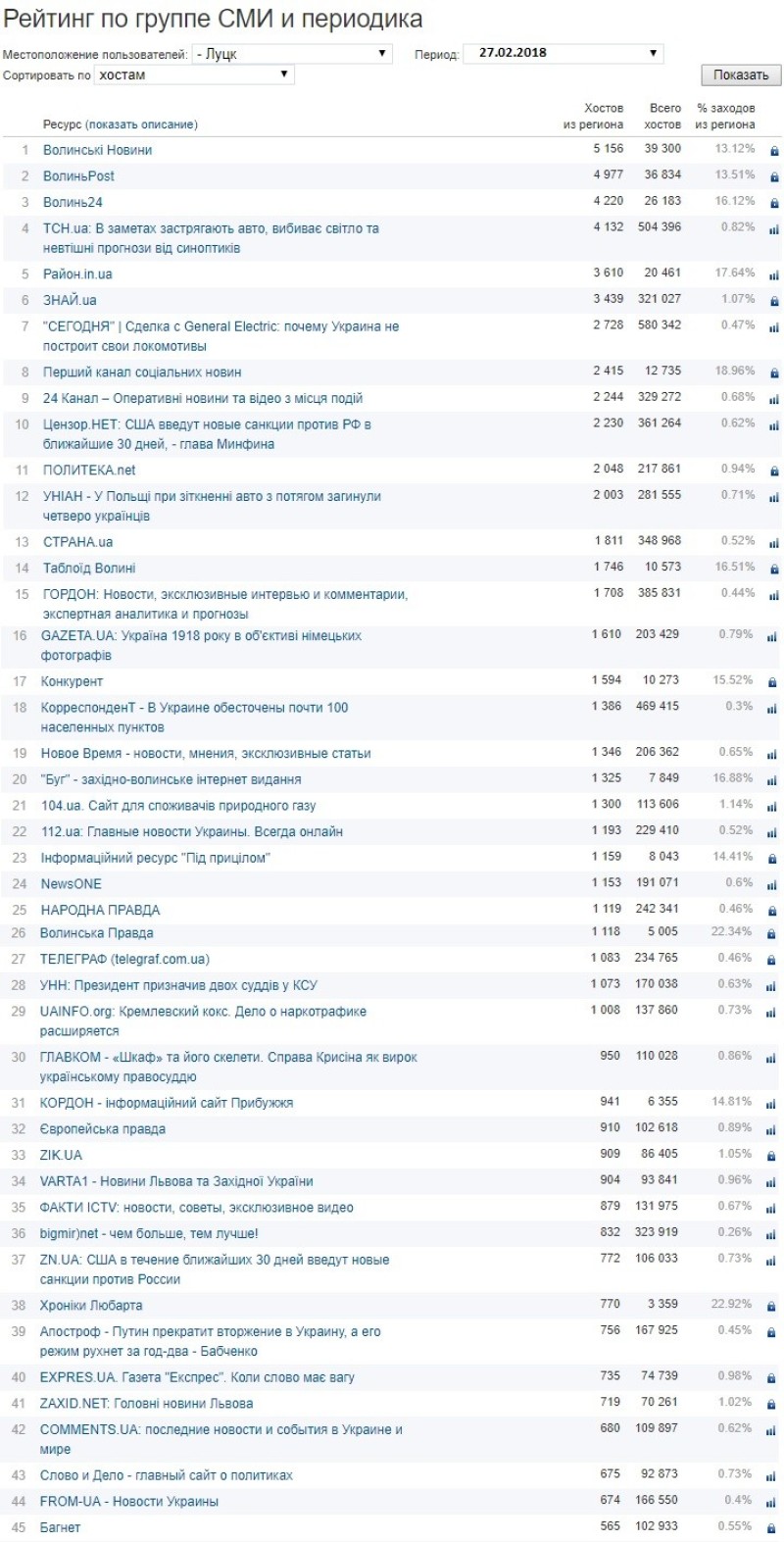 Таким чином, за кількістю середніх регіональних хостів (ІР-адреса мережі, яка видається провайдером або регіональним інтернет-реєстратором), ми визначили ТОП-10 волинських видань, які щодня виходять на першу сторінку рейтингу «Bigmir)net» по області. А себто – є найбільш популярними серед волинських інтернет-користувачів.