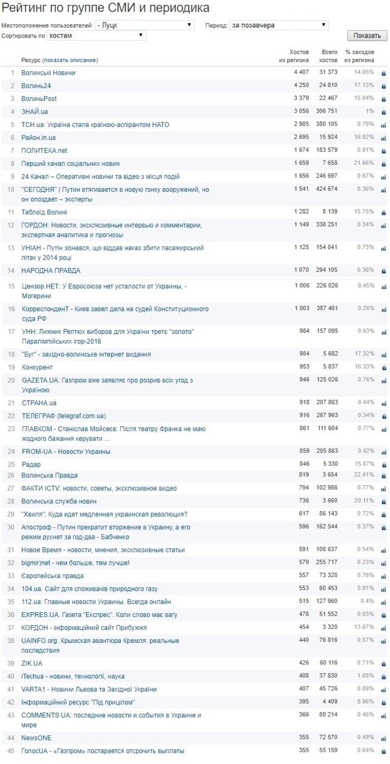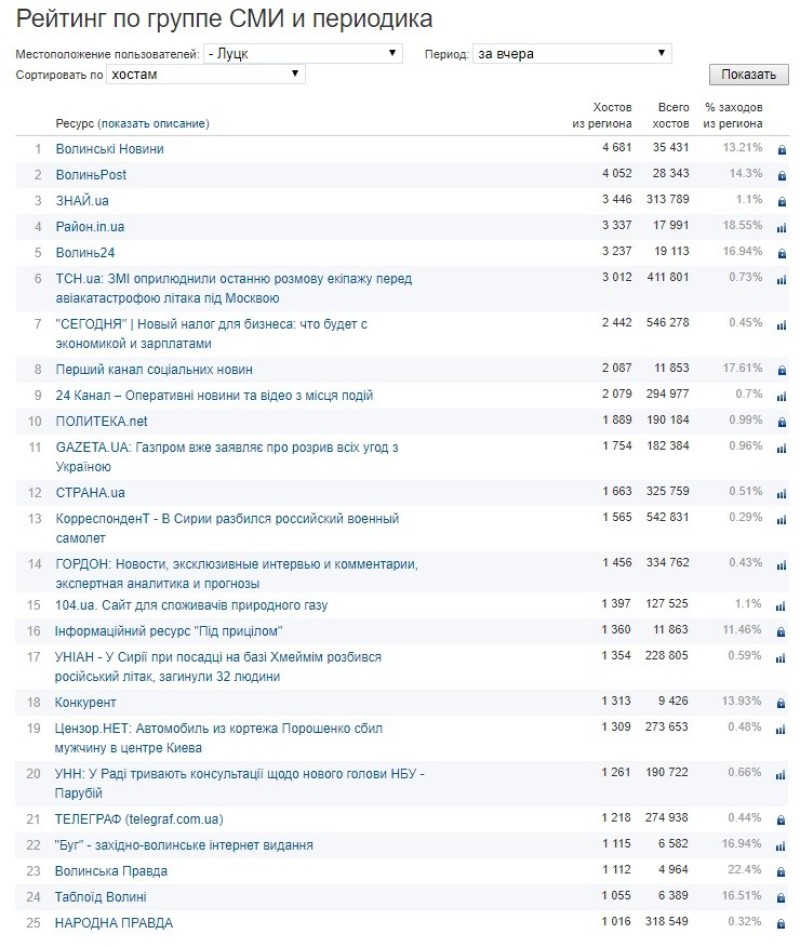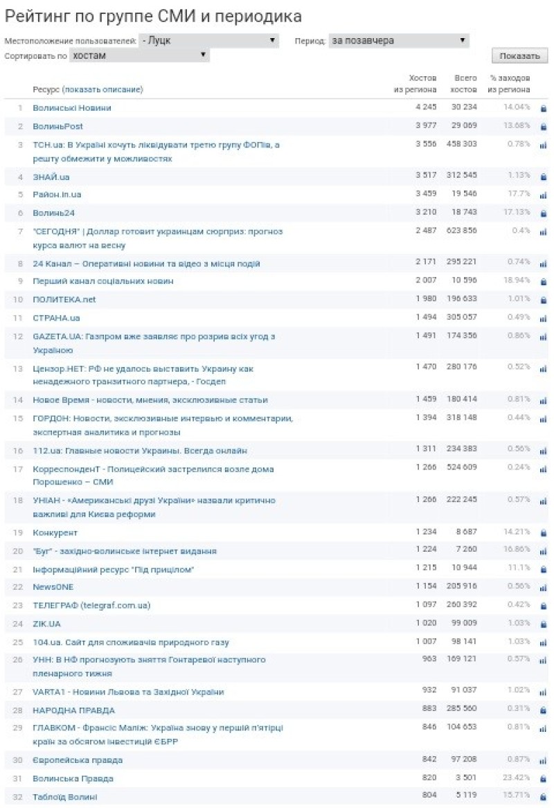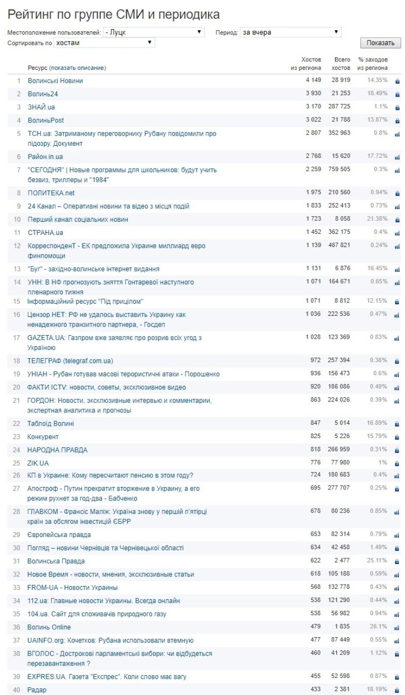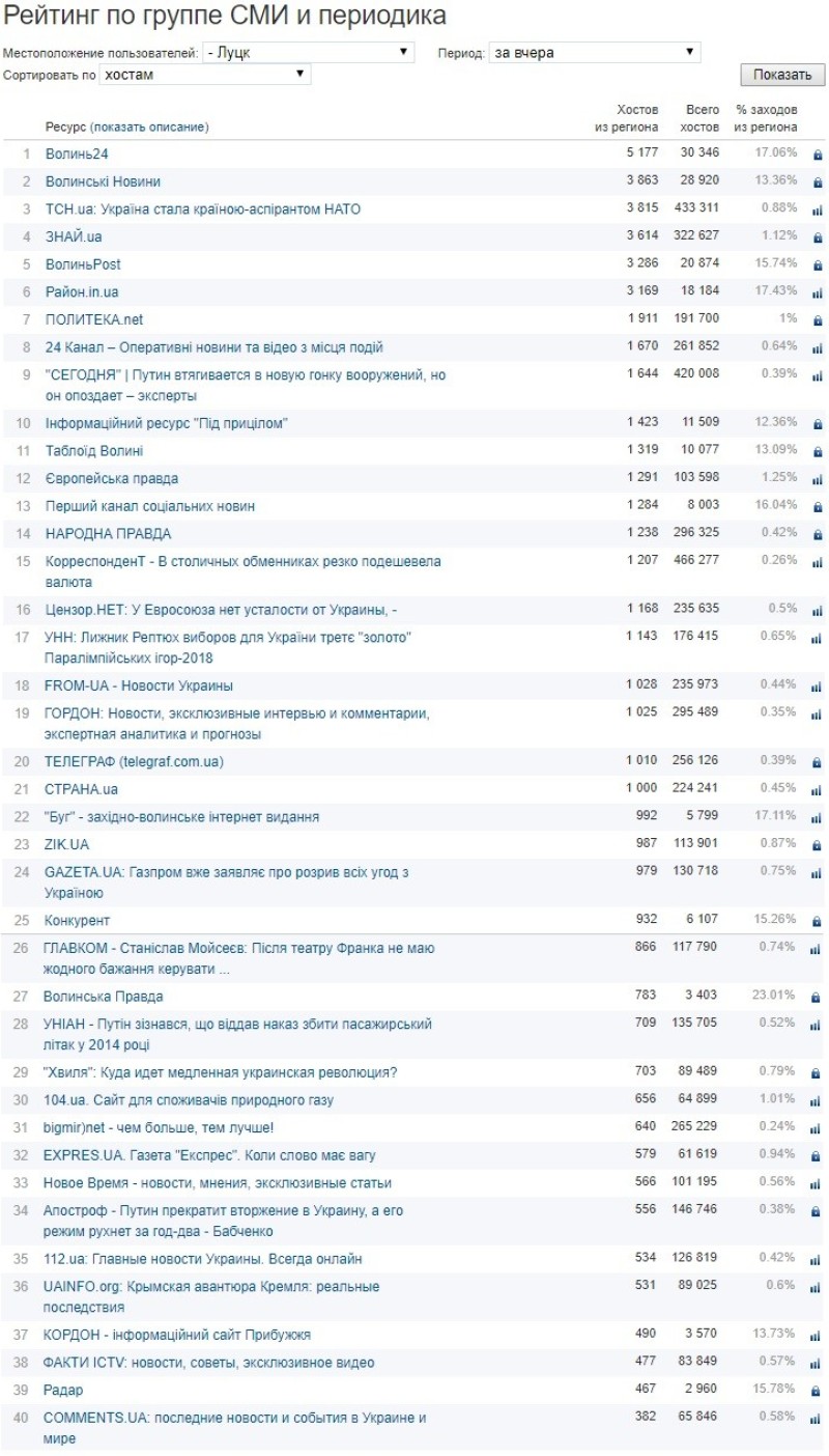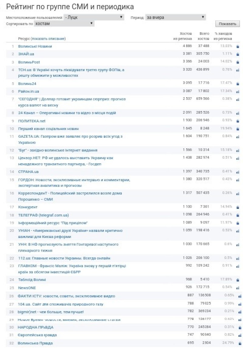 Перший продовжує аналізувати рейтинги сайтів з «волинською» пропискою на основі відкритих даних сайту «Bigmir)net». Зокрема, у розділі «Рейтинг по групі ЗМІ та періодика» за останній тиждень вдалось зібрати дані та визначити ТОП-10 найбільш читабельних сайтів Волині, виключивши з рейтингу решту популярних всеукраїнських видань (ТСН, Сегодня, 24 канал, Цензор.net, і т.д.). Інформація збиралась протягом останніх 7 днів тижня, з врахуванням не лише щоденних хостів у робочі дні, а й у вихідні.
