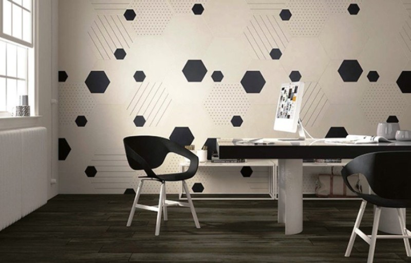 Геометричні візерунки з шестикутниками наносять на керамічну плитку для оздоблення стін і підлоги. Такі моделі часто стилізують під дерево, бетон або імітацію асфальтової кладки.