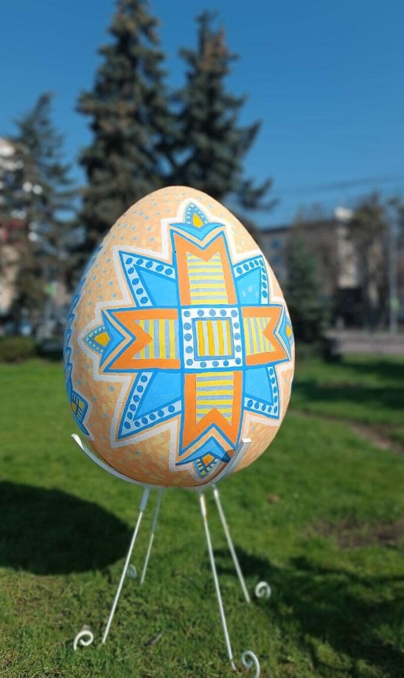 Пасхальна композиція артоб’єктів «Великдень», виконаних у жовто-блакитній кольоровій гамі із зображенням Державної символіки України демонструє патріотизм та глибоку віру українців в перемогу світла над темрявою, добра над злом
