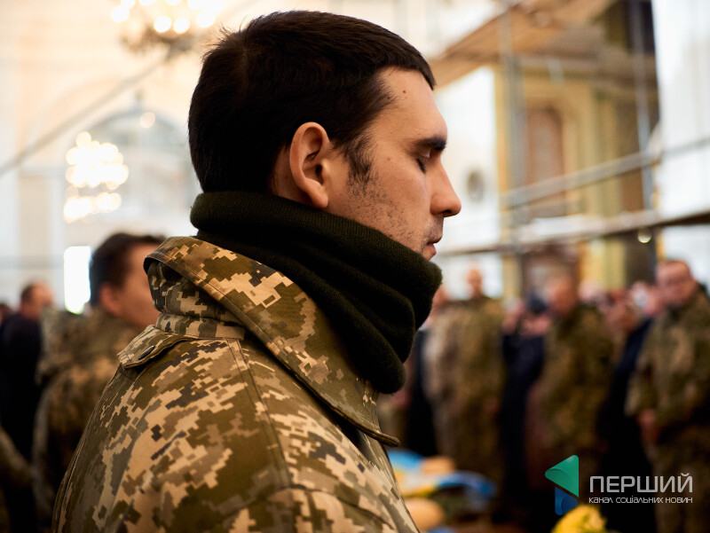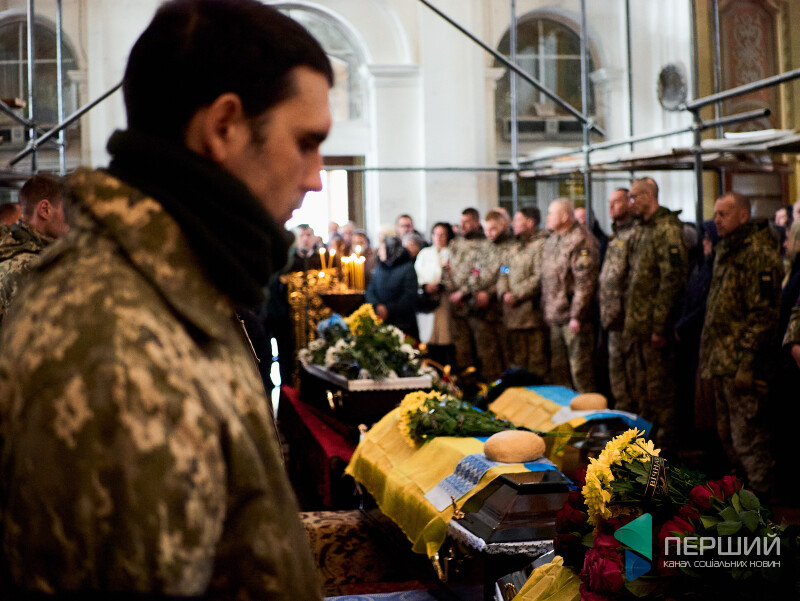 Коли побратими загиблих із їхніми портретами у руках рушать із двору собору, коли на дзвіниці озвуться дзвони, люди у дворі стануть на коліна.