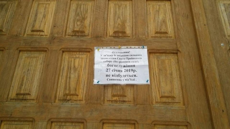 За словами Точинського, священик зачинив Свято-Троїцький собор та повісив на дверях оголошення про те, що «у зв'язку з загрозою силового захоплення храму» скасовується Богослужіння (до рішення суду).