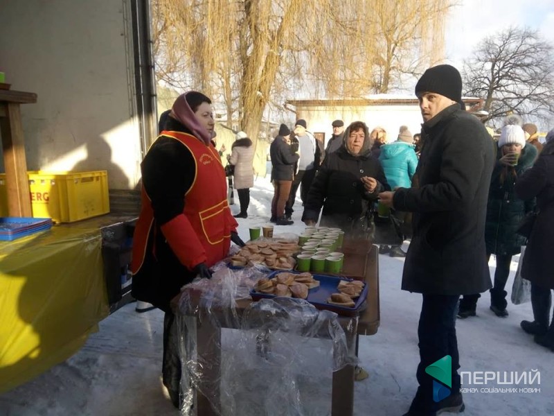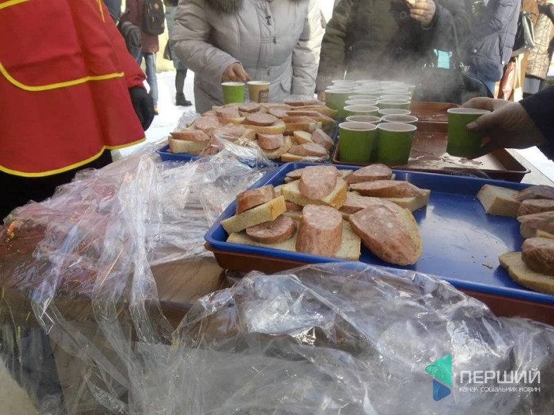 На площі встановили столи, на яких розклали бутерброди із ковбасою. Також людям пропонують гарячий чай.
