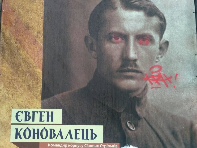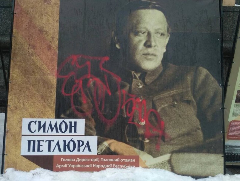 У ніч проти 8 березня невідомі розмалювали банери виставки "Українська революція 1917-1921". Експозиція розташована просто неба на Хрещатику, біля "Укрпошти".