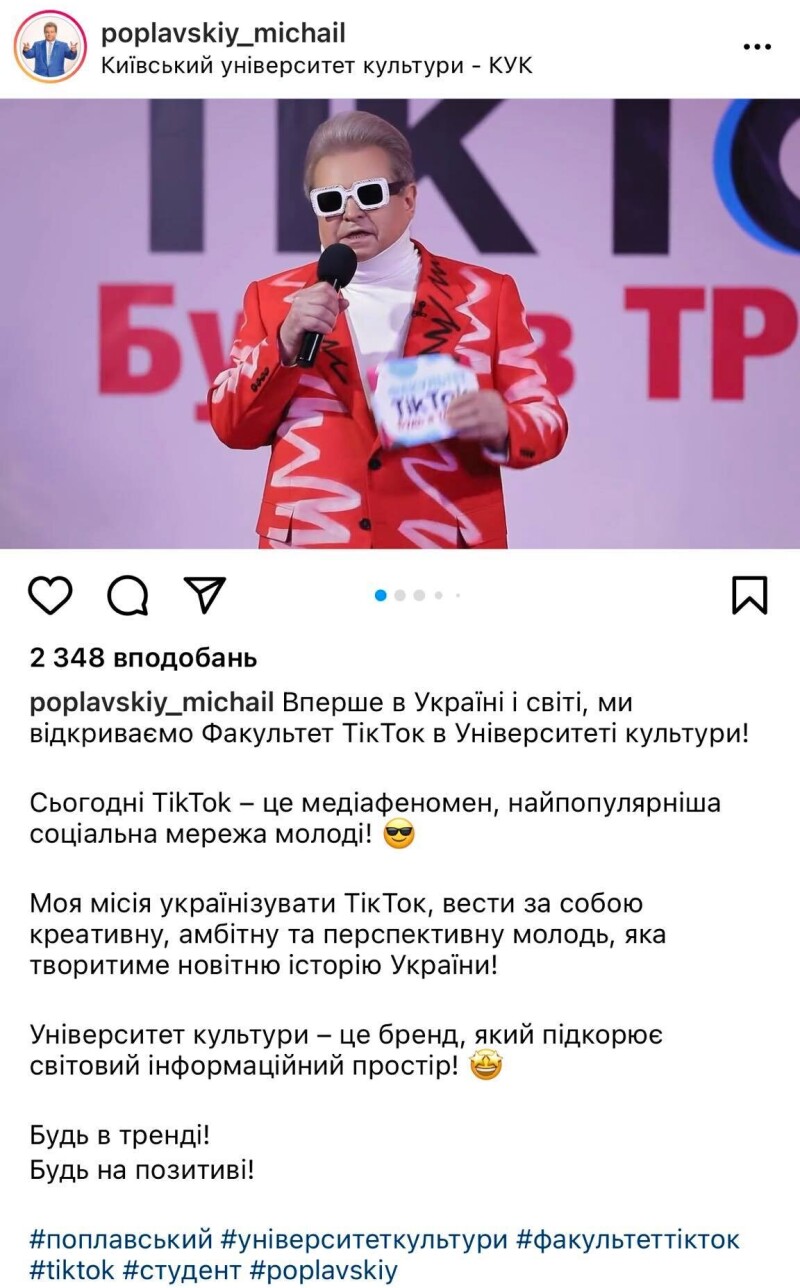 «Вперше в Україні і світі ми відкриваємо Факультет Тік-Току в Університеті культури! Сьогодні Тік-Ток – це медіафеномен, найпопулярніша соціальна мережа молоді!», – йдеться у дописі.