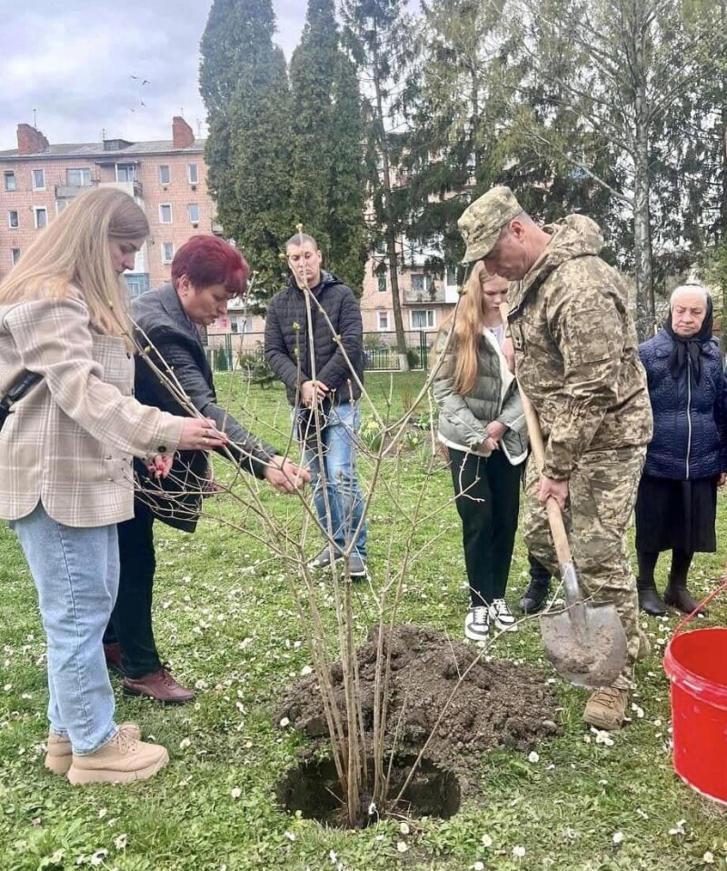 За давньою українською традицією, одинадцятикласники разом із рідними Захисників, військовими, селищним головою посадили кущі калини.