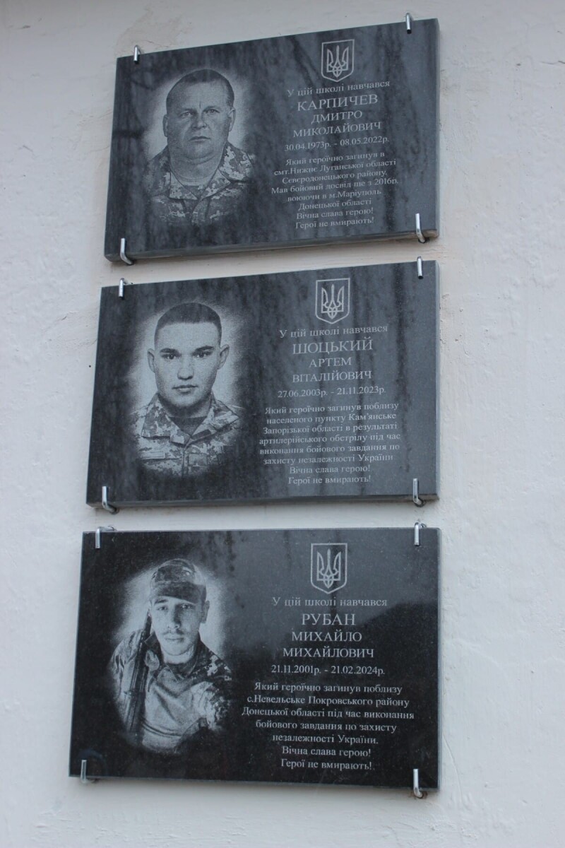 У Підгородненській гімназії відкрили меморіальні дошки загиблих захисників – Дмитра Карпичева, Артема Щоцького, Михайла Рубана.