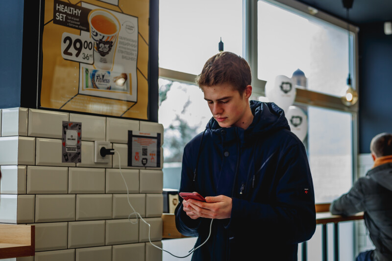 Біля вікон – барні стійки зі стільцями. Для зручності клієнтів — електричні розетки, WI-FI-доступ до інтернету.