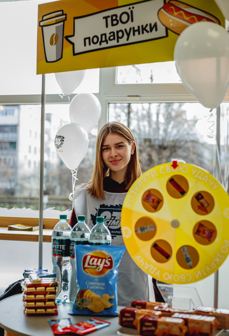 У день відкриття, 13 березня, в магазині діють акції: за кожен чек від 100 гривень покупець отримує шоколадку. Усім дітям вручають солодкий напій. Кожен сьомий чек – виграшний.