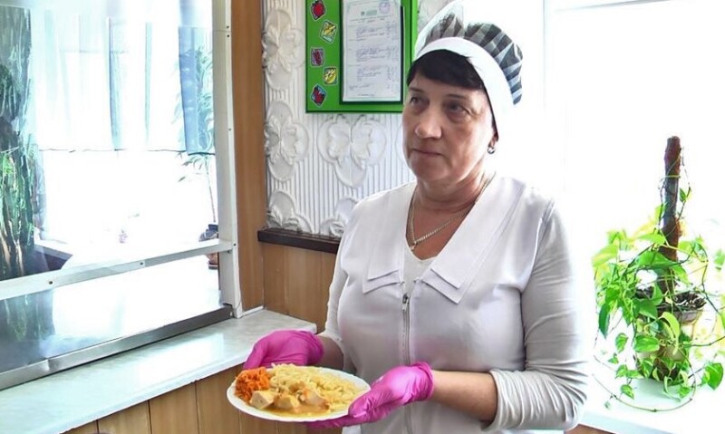 "Сьогодні в нас макарони в меню 120 грамів, салат з моркви 30 грамів і курочка в соусі 40 грамів. До цієї порції іде компот та булочка. Є такі дітки, які дуже добре їдять, аж приємно дивитися, є такі хто тільки котлетку, гарнір чи салат", – говорить працівниця.