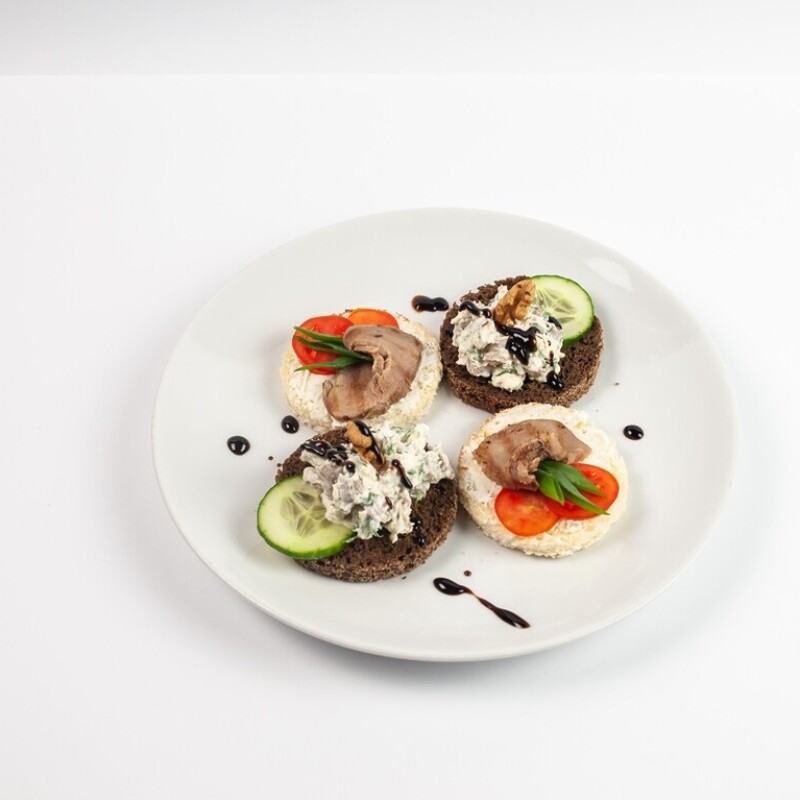 Це смачна страва – тости з грильованим язиком та поєднанням грецького горіху, язика і сиру «Фета».